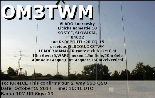There was apparently a sweet — albeit brief — opening on 6 Meters this afternoon. I worked HC5VF in Ecuador at 20:48 UTC. There was also a nice opening yesterday on 10-Meters, during which I worked EA6AZ in Spain and OM3TWM in Kosice, Slovakia. Here’s the eQSL card for the QSO to Slovakia: