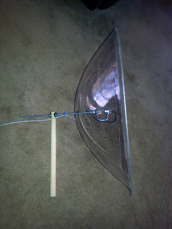 Just a few quick photos of the 22″ parabolic reflector with ultrasonic transducer I built yesterday for locating arcing RFI sources. ~ 73 from KK4ICE