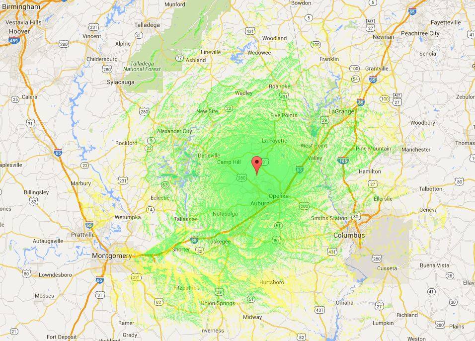 The predicted coverage for the 442.175(+) Opelika, AL repeater when it goes online. Actual coverage may vary from this, but it should still be a fairly nice footprint.