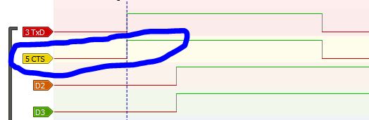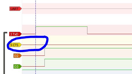 Logic analyzer connected to pins 3 and 5, as viewed using the Sigroc software at power-up. No activity seen on pin 5 (RTS.)