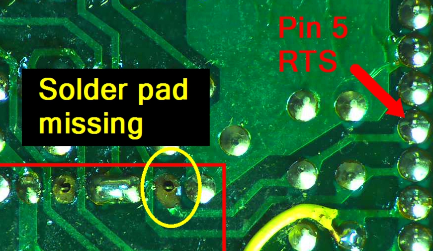 With a jumper/bridge wired to replace the missing pad and trace, on reassembly and power-up pin 5 (along with pin 3) of the RS232 connector switches to low almost instantly, as confirmed here with the breakout box. Done tater.